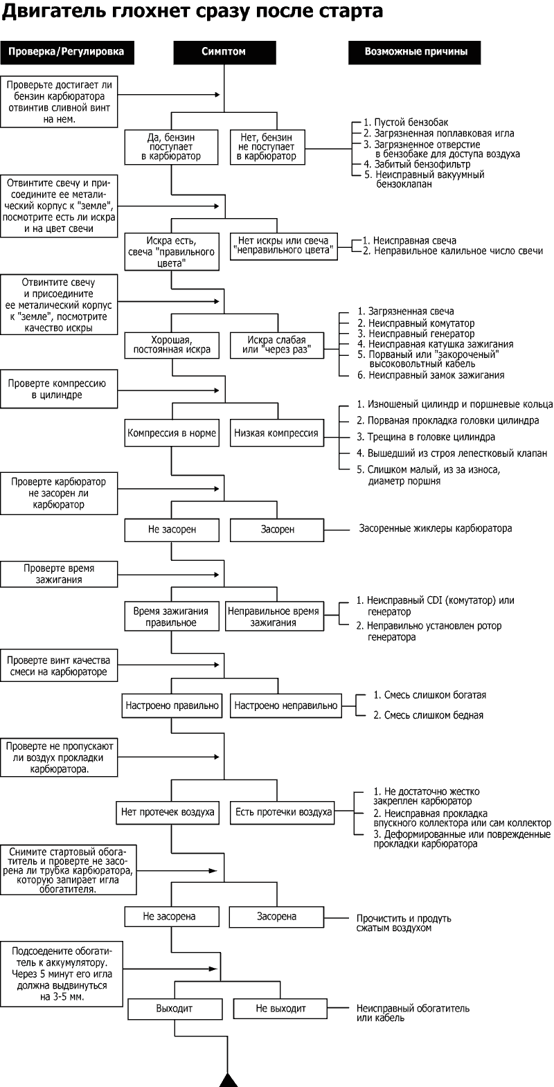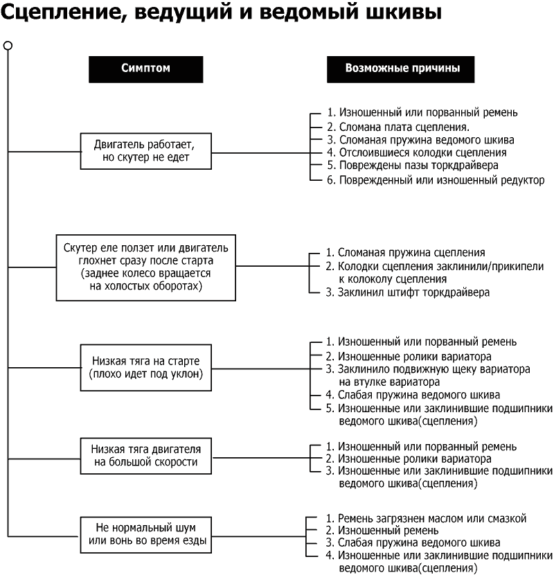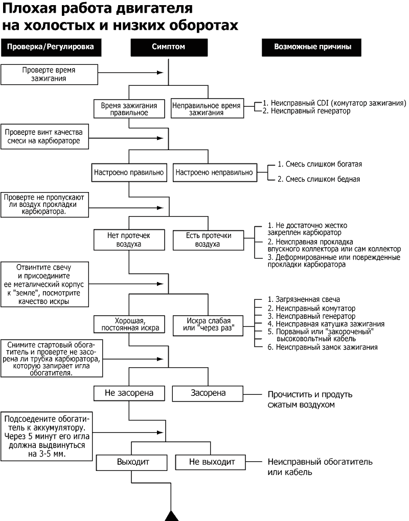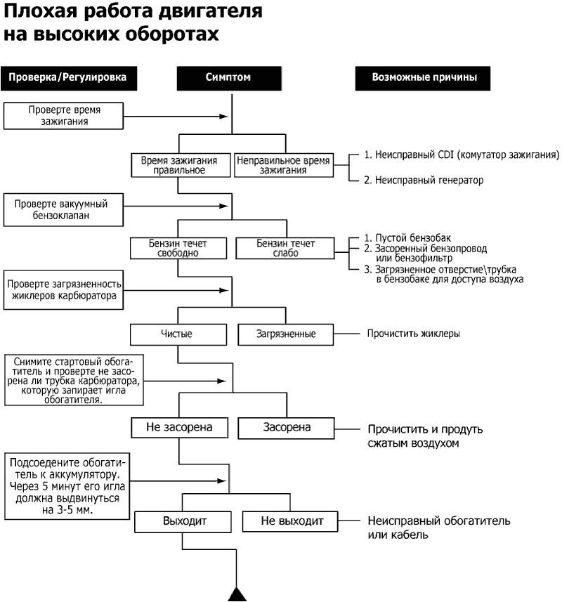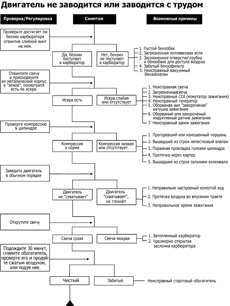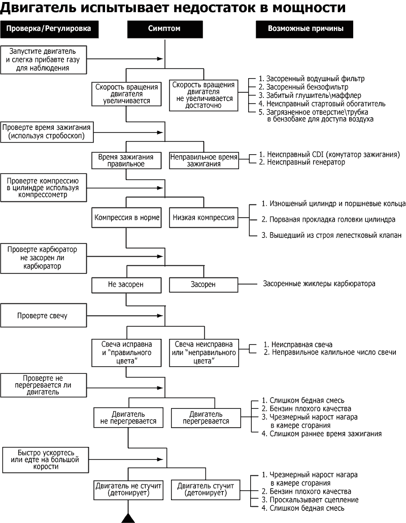 Ниже приведены блок-схемы для выявления неисправностей у 2Т скутеров по следующим симптомам: