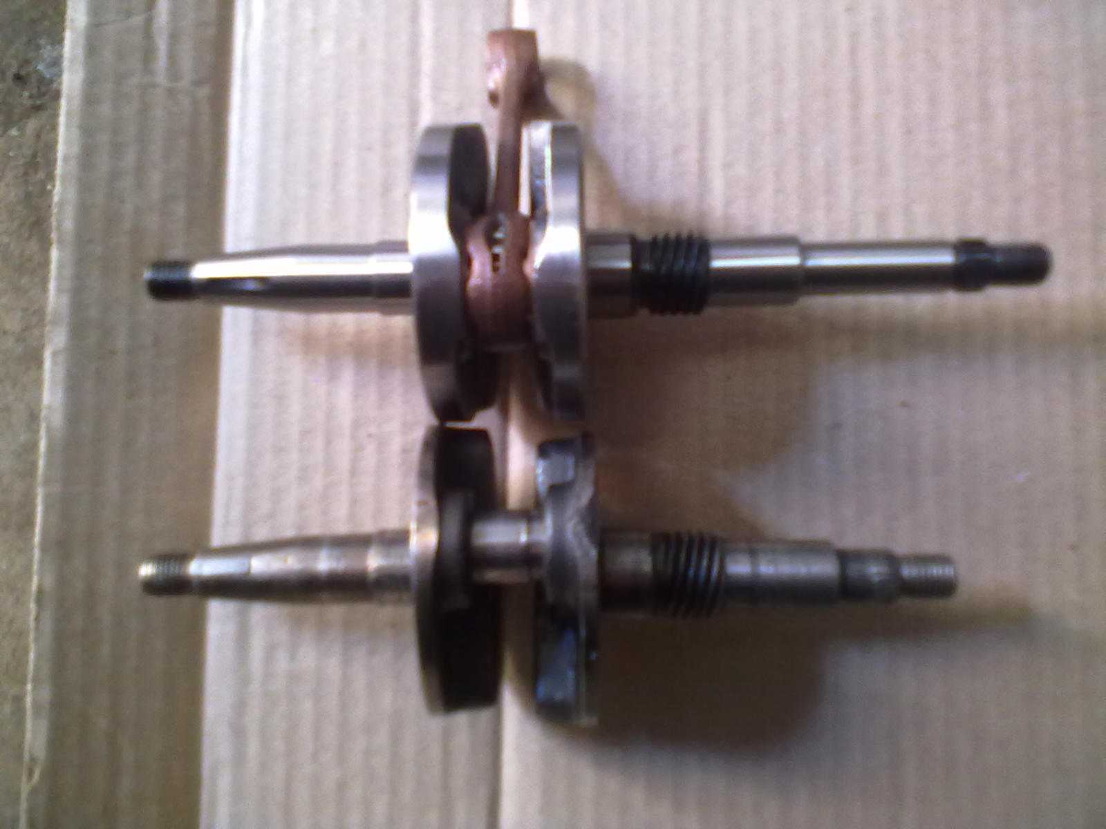 и посадочным местам переднего вариатора не подходил. И ТУТ ВСЕ НАЧАЛОСЬ... 1. Нашел токаря, который взялся переточить коленвал под размеры старого, поставил шайбы и нарезал канавки для диска.400 руб. и готово. 2. Дальше дело хуже. Колено не влезло в картер. Диаметр больше родного. Теперь нашел расточника цилиндров. Отдал ему обе части картера и коленвалы(новый и старый). Он расточил внутреннею часть картера под размер коленвала такта af16. 500 руб. и готово. 3. Собрал. 4. И вот оно чудо - Завелась! Обкатал и теперь рад бы выехать, да вот только уже 5 дней дождь льет... Желаю Вам всем такой же удачи в ремонте. А запчасти найдете здесь: www.motochasti.ru Р.S. Там и запчасти не дорогие + скидки + и даже подарки... На фото сверху - коленвал от такта, снизу от евы |